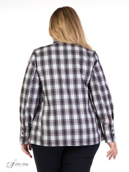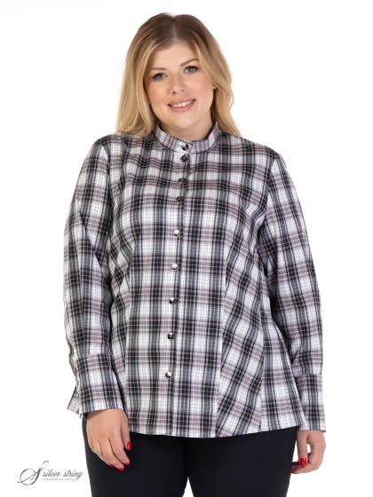 Стильная блуза прямого силуэта выполнена из смесовой ткани с рисунком в клетку. Изделие с втачным длинным рукавом. Низ рукава оформлен притачной манжетой. Высота манжеты позволяет носить её на отворот, тем самым регулируя длину рукава. Воротник рубашечный на стойке. На полочке обработана застежка на пуговицы. По бокам, ниже уровня талии, расположены вставки со складками, придающие дополнительную свободу по бедрам. Эта комфортная модель отлично скроет проблемные зоны и позволит выглядеть модно и стильно.