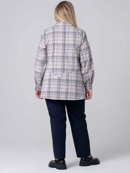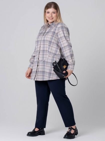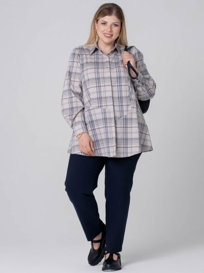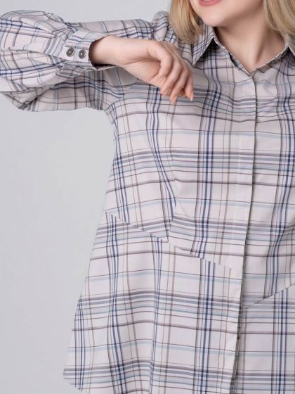 Эффектная блуза – рубашка, А-образного силуэта, выполнена из смесовой ткани с рисунком в клетку. Изделие с рубашечным воротником на стойке и супатной застежкой на пуговицы. Рукав длинный, с притачной манжетой. Обхват манжеты можно регулировать за счет парных пуговиц. Модель асимметричного кроя: разноуровневые, наклонные подрезы по полочке и спинке создают замысловатый геометрический рисунок. Модель прекрасно маскирует проблемные зоны, создавая ощущение комфорта и свободы.