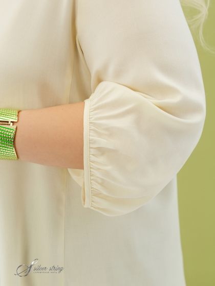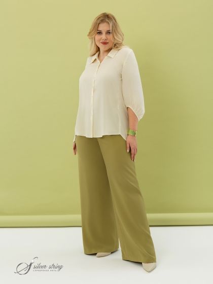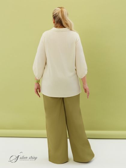 Эффектная Блузка прямого силуэта выполнена из гладкокрашеной ткани с высоким содержанием натурального волокна. На полочке обработана застежка на пуговицы. Рукав втачной, объемный, длиной 3/4. Низ рукава имеет удлинение со стороны локтя и присобран на узкий рулик. На отложном воротнике, ближе к уступам, заложены складки. Линия низа спинки несколько удлинена относительно полочки и плавно скругляется к рельефным швам. Модель отлично маскирует проблемные зоны. Невесомая ткань и оригинальный крой придают образу трогательную женственность.