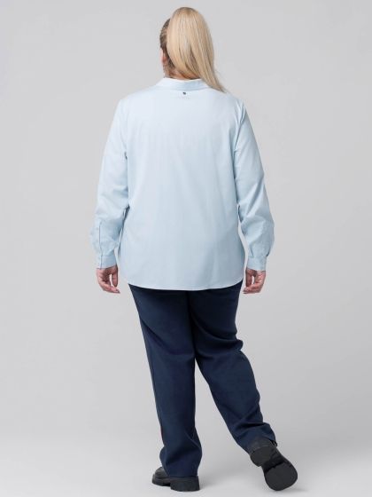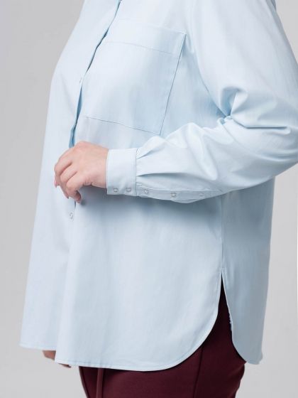 Стильная блузка-рубашка в стиле «Casual» изготовлена из смесовой эластичной ткани с высоким содержанием хлопка. Модель с застежкой на изящные кнопки и рубашечным воротником на стойке. Рукав втачной, длинный, с притачной манжетой по низу. На кнопки застегивается манжета и высокая шлица на рукаве, что делает изделие более элегантным. На спинке расположена декоративная нашивка с фирменным логотипом-аббревиатурой. В боковых швах обработаны разрезы скругленной формы, которые добавляют удобства и свободы движений. Эта блузка - идеальный выбор для создания делового и стильного образа на каждый день!