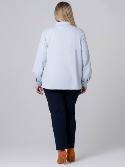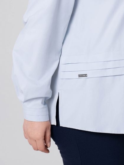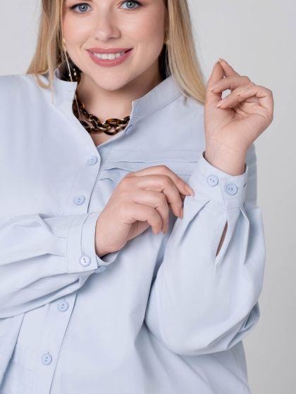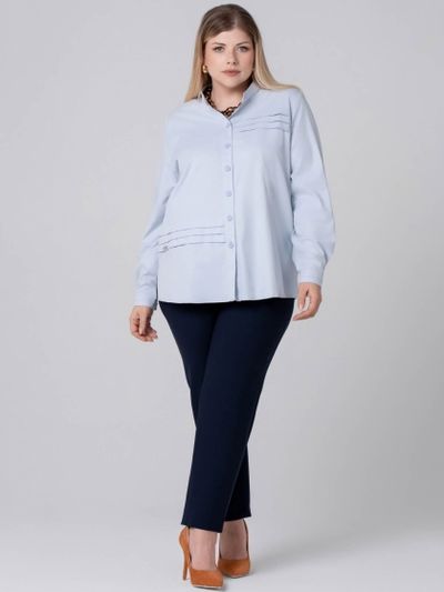 Оригинальная блуза полуприлегающего силуэта в стиле «Casual» выполнена из гладкокрашеной ткани с высоким содержанием хлопкового волокна. Особого внимания заслуживает качество материала: ткань шелковистая, приятная на ощупь, с благородным блеском. Блуза выглядит очень эффектно за счет асимметрично расположенных горизонтальных складок на полочке. На левой стороне складки застрочены выше уровня груди, а на правой - ниже линии талии. Модель с длинным втачным рукавом на манжете и воротником-стойка. По борту расположена застежка на пуговицы. В боковых швах обработаны разрезы. Изделие отличается динамикой, что в сочетании с отличной посадкой позволит Вам выглядеть современно и стильно.