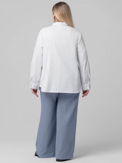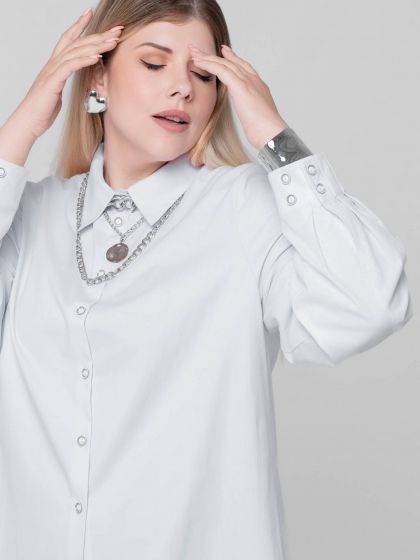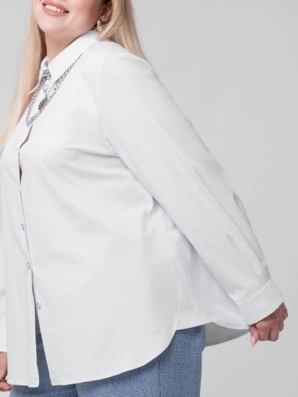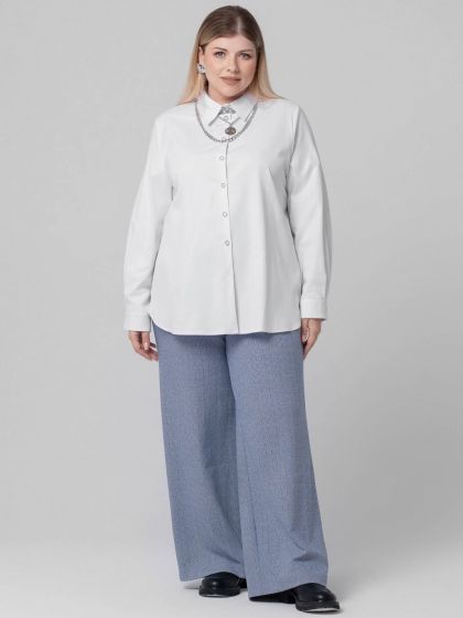 Стильная блузка-рубашка в стиле «Casual» изготовлена из смесовой эластичной ткани с высоким содержанием хлопка. Модель с застежкой на пуговицы и рубашечным воротником на стойке. Рукав втачной, длинный, с притачной манжетой по низу. Часть манжеты заложена складками, переходящими в складки рукава. Объем манжеты можно регулировать за счет парных пуговиц. В боковых швах обработаны разрезы скругленной формы. Такой крой отлично маскирует проблемные зоны и стройнит фигуру. Непринуждённость и удобство модели сочетается со сдержанностью делового стиля, поэтому Блузка, безусловно, станет базовой вещью в Вашем гардеробе.