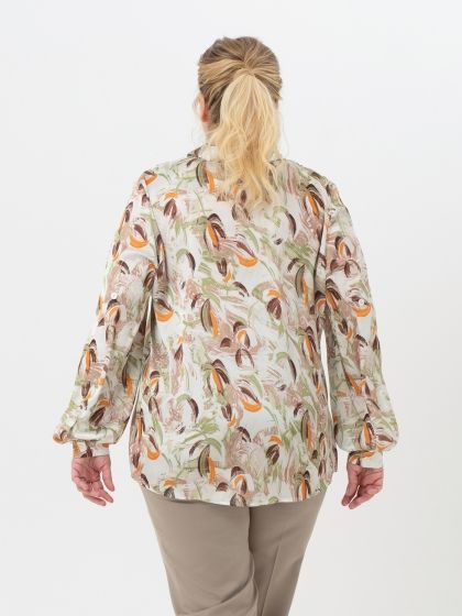 Оригинальная блузка из шелковистой смесовой ткани идеальна для создания элегантного образа! Модель прямого силуэта, с рубашечным воротником на стойке и длинным, втачным рукавом. Низ объемного рукава обработан притачной манжетой. Обхват манжеты можно регулировать за счет парных пуговиц. С помощью вертикальной паты можно слегка задрапировать рукав по линии локтя, тем самым корректируя его длину. В боковых швах расположены разрезы. Эффектный рисунок добавляет изделию изысканности и женственности. Эта блузка отлично подойдет для создания стильного образа на каждый день и для особых случаев.