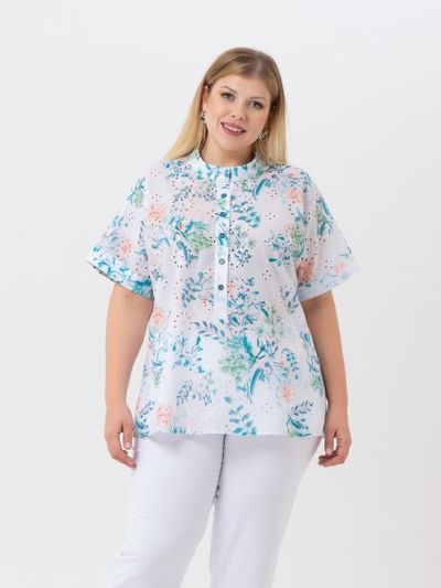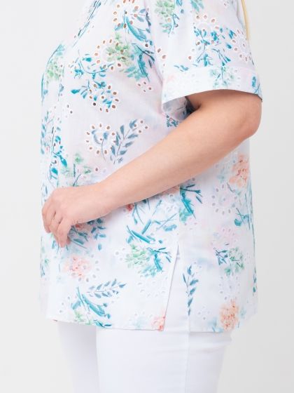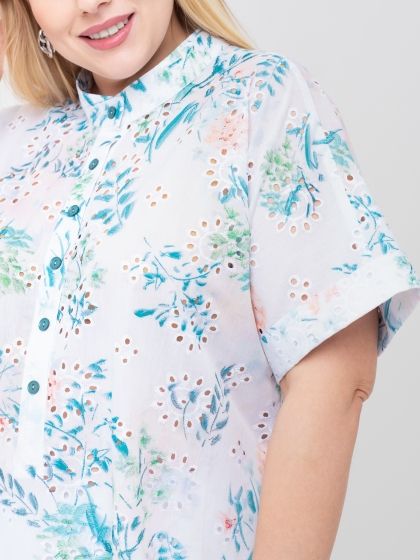 Очаровательная блузка свободного силуэта из ткани с перфорированной вышивкой в технике «Ришелье» и цветочным рисунком — Ваш идеальный выбор для создания легкого, летнего образа. Модель с цельнокроеным коротким рукавом. Низ рукава оформлен отворотом. Воротник стойка в сочетании с застежкой-поло придают модели динамичность и современный вид. В боковых швах расположены разрезы. Эта Блузка - отличный выбор для тех, кто ценит комфорт и хочет выглядеть модно.