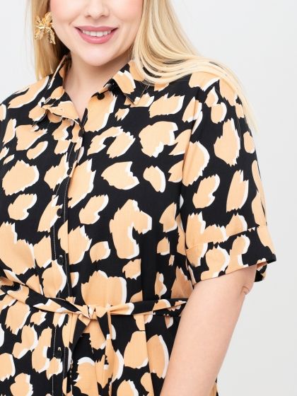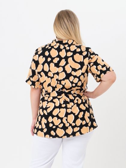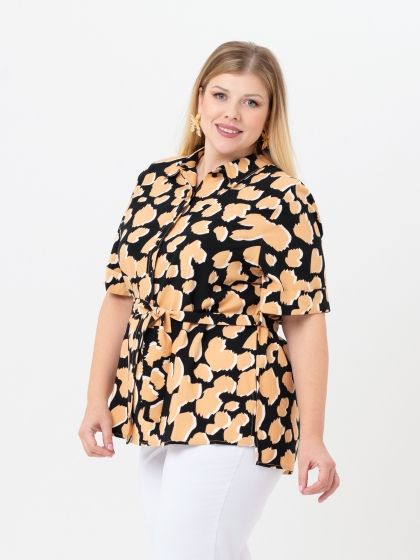 Эффектная блузка прямого силуэта выполнена из натуральной ткани с контрастным анималистическим рисунком. Модель с рубашечным воротником на стойке. Край борта оформлен вертикальной планкой с застежкой на пуговицы. Рукав короткий, с отворотом по низу. Блуза дополнена широким поясом, который выгодно подчеркнет женский силуэт. Модель прекрасно комплектуется с широкими брюками. Эффектная ткань и отличная посадка модели подчеркнёт шарм и стиль каждой женщины, независимо от её форм.