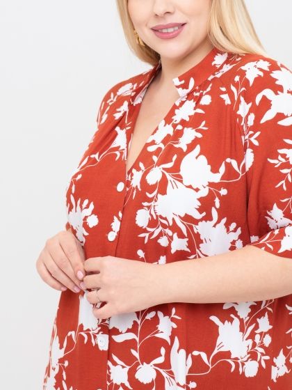 Яркая блузка прямого силуэта выполнена из вискозной ткани с контрастным цветочным рисунком. Модель с рукавом покроя реглан, длиной до локтя. Низ рукава оформлен ложным отворотом. Линия борта с застежкой на пуговицы переходит в У-образный вырез. Воротник - стойкой. Горловина полочки, по линии стойки, слегка присборена. В боковых швах расположены разрезы. Модель прекрасно маскирует проблемные зоны, создавая ощущение комфорта и свободы. Струящаяся ткань и яркий принт придают образу трогательную женственность.