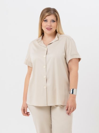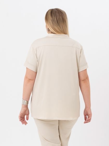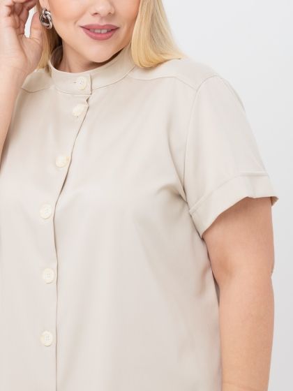Стильная блузка-рубашка в стиле «Casual» изготовлена из гладкокрашеной ткани с высоким содержанием натурального волокна. Модель с застежкой на пуговицы и воротником стойкой. Рукав втачной, длиной до локтя. Низ рукава оформлен ложным отворотом. Кокетка на полочке и спинке отстрочена по контуру нитками в цвет ткани. В боковых швах обработаны разрезы. Графичность, непринуждённость и удобство отлично сочетаются в этой модели спортивного стиля.