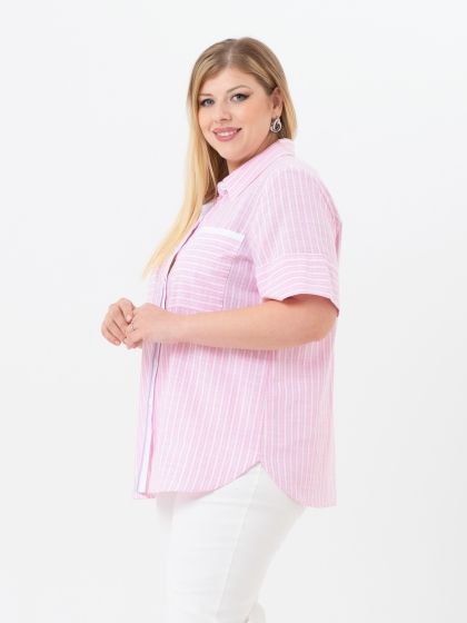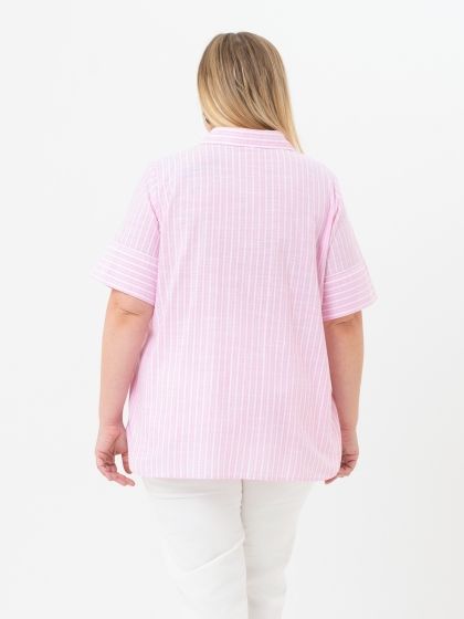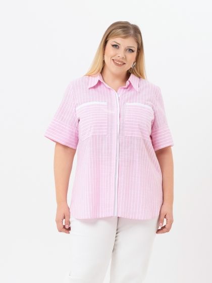 Очень свежо выглядит блузка-рубашка из хлопковой ткани в розовую полоску. Полоска занимает постоянно лидирующие места в списке трендов сезона, а нежный и жизнерадостный цвет способствует созданию приподнятого летнего настроения. Модель с рубашечным воротником на стойке и коротким втачным рукавом. Нижняя часть рукава раскроена с поперечным направлением рисунка, и выполнена таким образом, что можно сформировать отворот. Супатная застежка вдоль линии борта обработана с привлечением отделочной ткани. Эта ткань применяется для отделки по верху нагрудных карманов. В боковых швах обработаны разрезы скругленной формы. Это базовая модель, которая прекрасно вписывается в любой гардероб и дает простор для творчества и самовыражения в создании собственного образа.