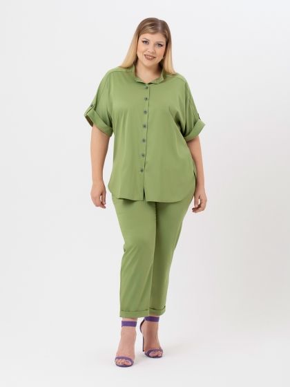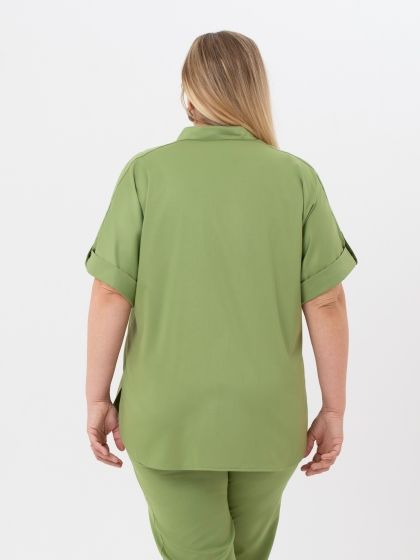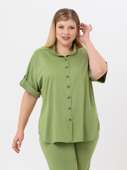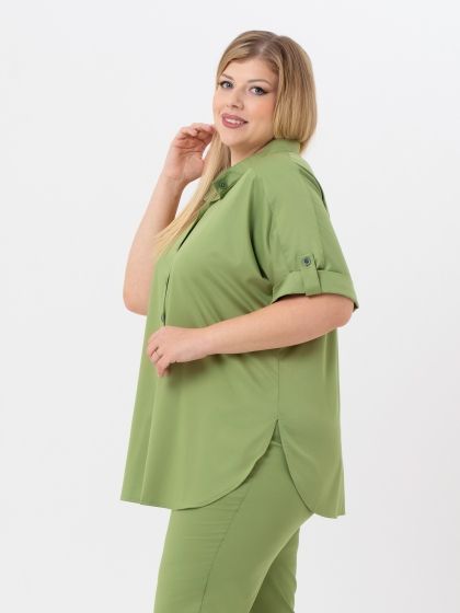 Идеальная модель для теплого времени года - блузка свободного силуэта из гладкокрашеной ткани с высоким содержанием натурального волокна. Изделие с воротником - стойкой и цельнокроеным коротким рукавом. Вдоль плечевого шва расположена кокетка-погон. Низ рукава оформлен притачным отворотом. Застежка на пуговицы. В боковых швах обработаны разрезы скругленной формы. Эта блузка, в качестве легкого жакета, отлично подойдёт для создания расслабленного, но стильного образа с различными топами и футболками. Это выбор тех, кто ценит комфорт и непринуждённость.