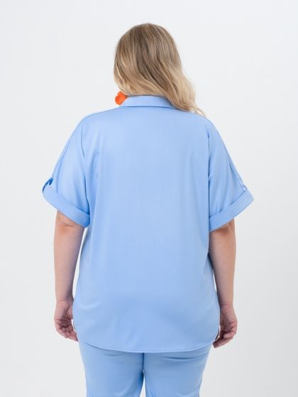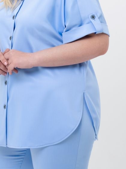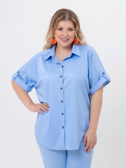 Блузка Т-образного силуэта, изготовлена из гладкокрашеной ткани с высоким содержанием натурального волокна. Изделие с рубашечным воротником на стойке и цельнокроеным коротким рукавом. Вдоль плечевого шва расположена кокетка-погон. Низ рукава оформлен притачным отворотом. По борту расположена застежка на пуговицы. В боковых швах обработаны разрезы скругленной формы. Модель отличают мягкие линии силуэта и отличная ткань, поэтому блузка прекрасно впишется в Ваш гардероб и станет незаменимой при создании разнообразных комплектов.