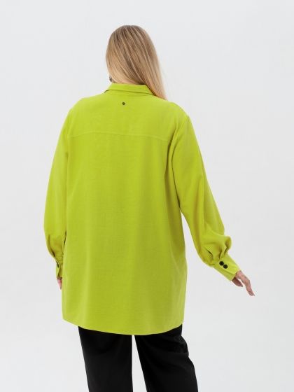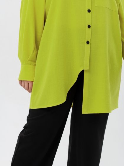 Удлиненная блузка прямого силуэта выполнена из однотонной смесовой ткани с высоким содержанием натурального волокна. Модель асимметричного кроя: низ правой полочки фигурно оформлен и значительно короче, чем у левой. На полочке и спинке расположены подрезные кокетки. Воротник рубашечный, на стойке. Длинный рукав оканчивается высокой манжетой, которую можно отогнуть, тем самым скорректировать его длину. По планке борта обработана застежка на пуговицы контрастного цвета. Модель отлично комплектуется с зауженными брюкам, создавая ощущение комфорта и свободы.