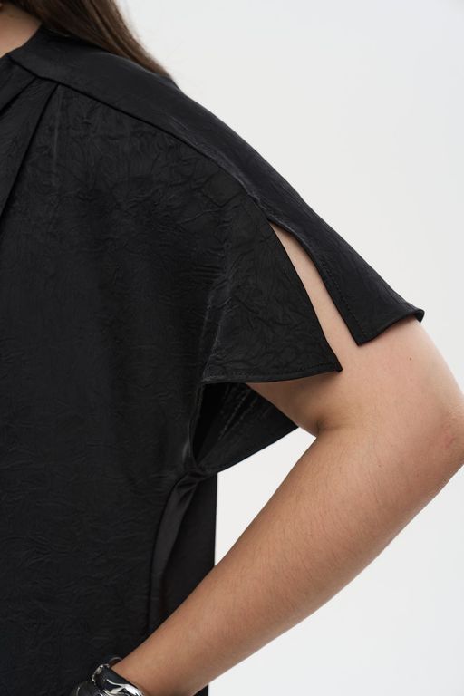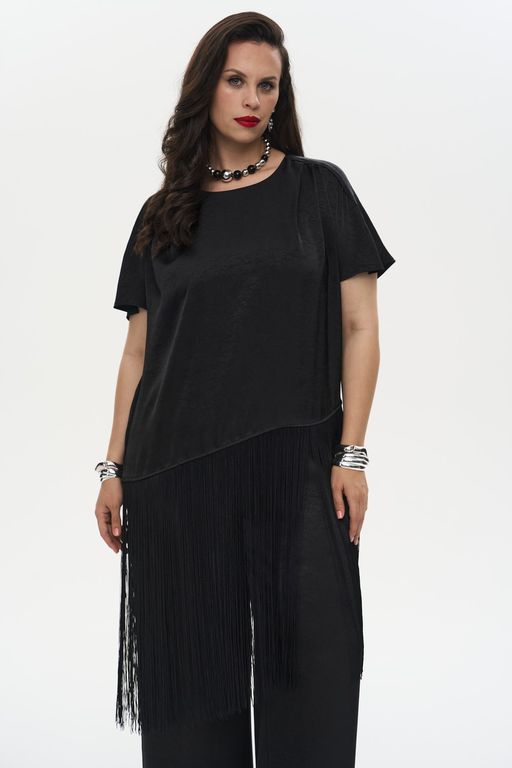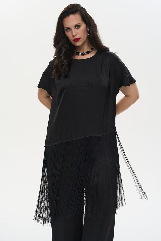 Блузка свободного кроя из плотной вискозы с креш-эффектом. Модель имеет цельнокроеные короткие рукава, круглый вырез горловины и асимметричный низ, декорированный длинной бахромой. На плечах заложены декоративные складки. Плечевой шов плавно переходит в маленький разрез на рукаве. Спинка оформлена средним швом и застежкой в виде капли с одной пуговицей.